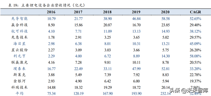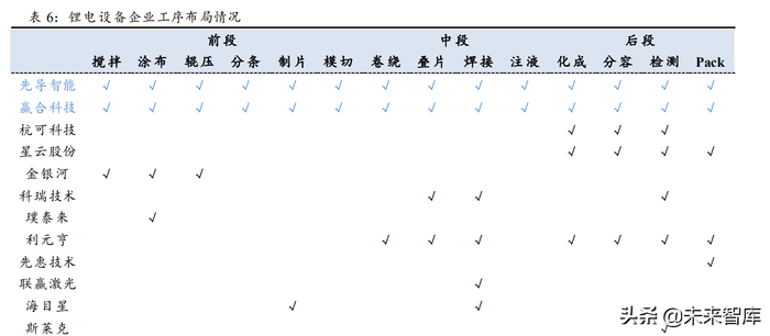 先导智能、赢合科技完成全工序布局,杭可科技为后段龙头。目前来看,在锂电设 备工序的布局企业中,先导智能、赢合科技属于全工序布局;璞泰来、金银河主要布局 前段工艺;科瑞技术、联赢激光主要布局在中段工艺;杭可科技、星云股份主要布局在 后段工艺。(报告来源:未来智库)
