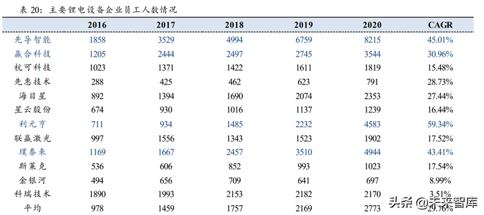 员工人数快速扩张反映行业高景气。2016-2020 年,选取的十二家锂电设备厂商人员 均实现一定程度的扩张,行业平均 CAGR 为 29.76%。其中发展最为迅速的三家厂商分别 为:利元亨(员工人数从 2016 年的 711 人增长至 2020 年的 4583 人,CAGR 为 59.34%)、 先导智能(员工人数从 2016 年的 1858 人增长至 2020 年的 8215 人,CAGR 为 45.01%)、 璞泰来(员工人数从 2016 年的 1169 人增长至 2020 年的 4944 人,CAGR 为 43.41%)。