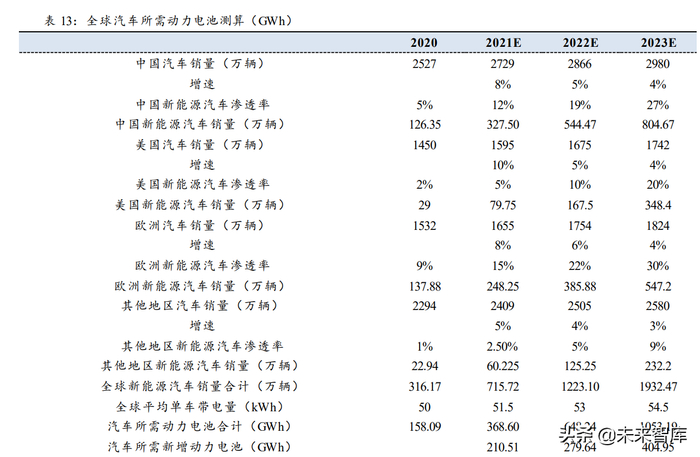 汽车所需的动力电池的测算: 假设 1:中国、美国、欧洲、其他地区在 2021-2023 年的汽车销量增速依次为 8%/5%/4%、 10%/5%/4%、8%/6%/4%、5%/4%/3% 假设 2:中国、美国、欧洲、其他地区在 2021-2023 年的新能源汽车渗透率依次为 12%/19%/27%、5%/10%/20%、15%/22%/30%、2.5%/5%/9% 假设 3:全球平均单车带电量 2021-2023 年依次为 51.5、53.0、54.5kWh。