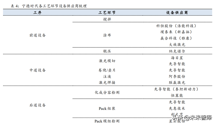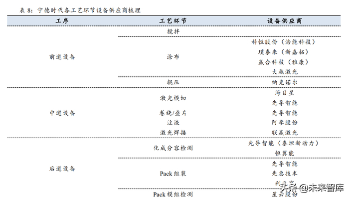 从各大锂电设备厂商中标电池厂商的情况以及宁德时代各工艺环节的设备供应商梳 理可以看出两点: