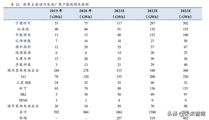据此,我们可以大致测算出 2021 年-2023 年汽车所需新增动力电池依次为 210.51、 279.64、404.95GWh。则所有动力锂电 2021 年-2023 年汽车所需新增动力电池依次为 210.51*1.1=231.56、261.84*1.1=307.60、404.95*1.1=445.45GWh。