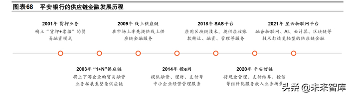以平安银行为例,作为国内最早提出供应链金融的银行,公司长期着力于金融科技的应用,如今主要通过物联网技术构建了 更立体的数字网络生态,在掌握资金流的基础上,线上通过门户、系统留存企业的商流和信息流,线下通过终端设备跟踪物 流,使得企业经营情况整体可控,并率先在智慧农业、智慧车联等产业落地了供应链实践,2021 年 1-9 月,平安银行供应 链金融融资发生额 6566 亿元,同比增长 34.5%。