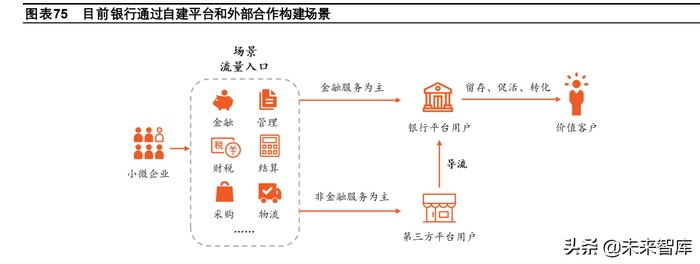 目前,大型银行主要通过自建平台和与对接第三方平台的方式,触达小微企业的重要经营数据,形成结算、电商交易、财 务管理等丰富企业场景。1)自建平台:通常自建线上电商平台,留存企业销售、物流等数据,作为小微企业的授信依据。2) 合作平台:与政府类机构和金融科技公司合作,全面渗透进纳税、交易、企业数字化管理(如 ERP、办公、财务管理)等 场景,批量获取客户和数据。