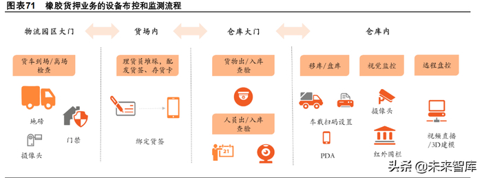 1)设备介入、实时监测,获取更全面可靠的风控数据。在实际操作过程中,通过 RFID 射频天线、激光雷达、红外电子围 栏等物联网设备及仓库管理系统(WMS)的介入,实现了对全业务流程的智能监测,真实触达了企业的仓储情况和物流流 程,为银行风控提供多维度数据。