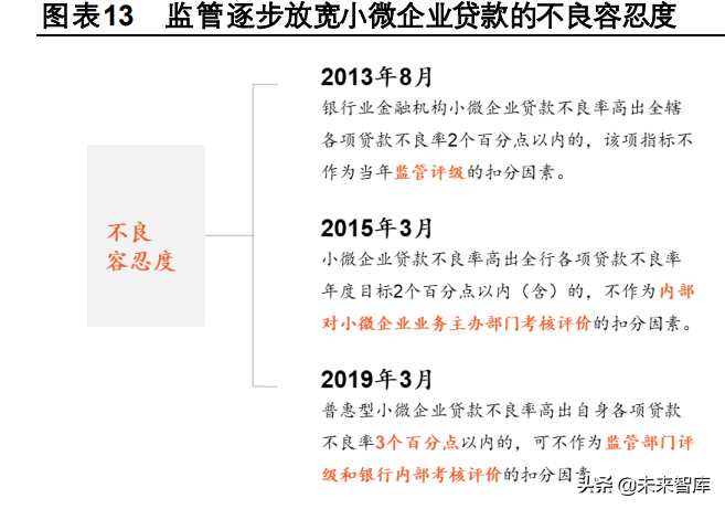 为增强普惠信贷供给,监管部门从不良容忍和尽职免责两个方面出发,推动金融机构改进内部绩效考核机制,从操作层面 提升基层信贷人员的积极性。1)适当放宽不良容忍度:监管规定,高出自身各项贷款不良率 3个百分点(原为 2个百分点) 的普惠小微贷款,可不作为监管评级和银行内部考核评价的扣分因素,银行可据此对小微企业不良贷款执行差别化的容忍度; 2)完善授信尽职免责制度:监管明确推行小微贷款业务授信尽职免责制度,对小微企业不良贷款率未超出容忍度标准的分 支机构,在无违反法律法规和监管规则行为的前提下,可对分支机构负责人、小微业务部门和从业人员免予追责,包括内部 考核扣减分、行政处分、经济处罚等责任。