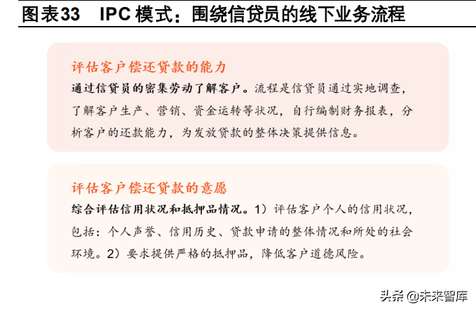 IPC 模式和信贷工厂模式为当下最主流的小微信贷模式:1)IPC 是最传统的小微信贷模式,由德国 IPC 公司研发,2005 年由国家开发银行引入中国,是一套围绕信贷员的劳动密集型业务流程。IPC以客户还款能力和还款意愿作为放贷的唯一标 准,强调对客户的深入了解和精细化管理。2)信贷工厂由新加坡淡马锡公司研发,通过设计标准化、数字化的业务流程, 构建出不同信贷产品的流水线作业,同时前中后台职责界限更加清晰,实现放贷效率提升,更加符合小微企业“短小频急” 的贷款需求。