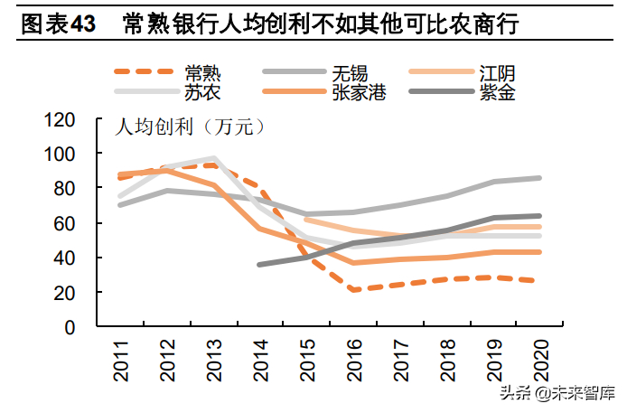 总结而言,在解决风险管控痛点上,我们看到常熟银行主要采取了两个措施:1)凭借信贷工厂模式的集中审批,实现风险 隔离;2)地推获客,真实触达小微企业,充分下沉有利于分散风险。 但需要注意的是,线下地推获客是一把双刃剑,在帮助常熟银行实现更有效风险管控的同时,也导致其获客成本较同业偏 高。2020 年常熟银行人均创利 26 万元(其他上市农商行平均为 62 万元),成本收入比较高,成本收入比为 42.8%(其他 上市农商行平均为 30.1%),在上市银行中仅低于邮储银行,高于绝大多数上市银行。