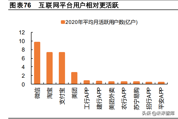 但是,传统银行的线上拓客能力距离互联网平台还有一定差距,因此银行与外部生态的开放合作至关重要,我们认为银行 可以根据自身资源禀赋,开放产品与场景的合作,吸收更多活跃第三方流量。
