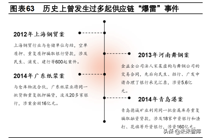 交易背景的真实性是供应链模式自洽的基础,但在早期供应链金融暴露了大量风控问题。供应链本身具备封闭性、自偿性和 连续性,针对特定行业,通过企业联保联贷,银行能够实现低成本的批量获客。但在早期,供应链金融的实践效果不佳,一 方面是因为银行在供应链获客上过于激进,主动对企业的互保联保放松了风控,未能监测、识别出企业的勾结欺诈,另一方 面银行也缺乏验证交易真实性的良好手段,叠加行业集中度过高,历史上发生了多起行业层面的供应链风险事件。