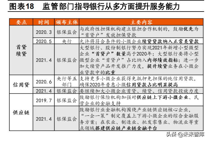 服务导向方面,为纾困小微企业融资,监管部门对金融机构提出以下具体发展导向:1)明确支持首贷、续贷投放,拓宽服 务覆盖面、保持服务连续性;2)鼓励加强信用贷投放,降低企业准入门槛;3)支持银行深入产业,围绕核心企业服务供应 链上下游小微企业,丰富服务形式;4)鼓励银行运用金融科技赋能产品和流程,提升服务效率。(报告来源:未来智库)