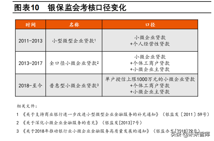 针对银行业金融机构,2018年银保监会设立了“两增两控”考核目标,对普惠小微贷款业务提出了增速和户数的双重要求。 相较于“三个不低于”,“两增两控”更严格地要求银行普惠型小微企业贷款(包括:单户授信总额 1000万元以下(含)的小 微企业+个体工商户+小微企业主贷款)实现两个增长目标:1)增速不低于各项贷款增速;2)有贷户不低于上年同期水平。 对于大型银行的要求更加细化, 2019/2020/2021 年政府工作报告要求大行普惠小微贷款增速分别高于 30%/40%/30%。