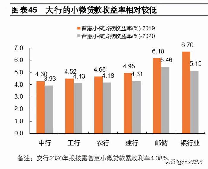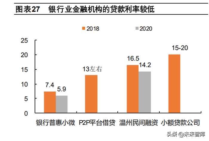 1)在信贷定价上,主要受到政策让利的影响,普惠小微贷款定价相对缺乏弹性。与其他贷款机构相比,银行普惠小微贷款 利率较低,主要受到减费让利等普惠金融政策影响,银行业金融机构的利润空间相对较小。目前,商业银行普惠小微贷款利 率位于 4%-6%区间,远低于民间融资(15%左右)和小额贷款公司(15%-20%)提供的贷款利率。