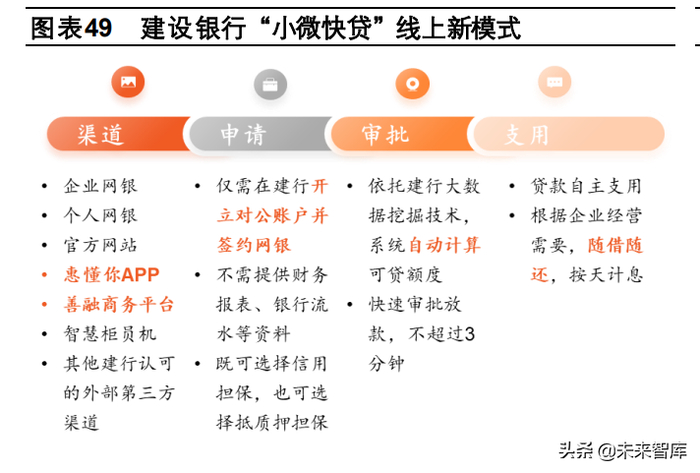 2016 年,建设银行运用互联网思维和大数据手段,在国内率先推出针对小微企业的全流程线上化产品“小微快贷”。“小微 快贷”可以通过建行多个线上渠道申请,贷款申请方式由员工采集输入革新为客户线上自助,通过结构化表单填写和自动化授信模型缩短审批时长,授信流程缩短至 3-5 分钟,大幅提升了申贷、审贷的效率。