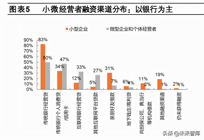 但在实际展业过程中,普惠小微金融仍然面临诸多挑战: 站在小微企业角度,小微企业在贷款申请时,面临办理周期长、门槛较高、渠道单一等融资难题。1)获批时间较长,据全 国工商联调查,42%的小型企业申请经营性贷款需要等待超过 1 个月;2)担保方式仍然以抵质押贷款和保证贷款为主,对 担保物稀少的小微企业形成了较高的门槛。据央行调查,2020 年末普惠小微贷款中信用类贷款占比仅为 20%;3)获贷渠 道以线下为主,缺乏便利性。据统计,2020 年末个人经营性互联网贷款余额 5871 亿元,占个人经营性贷款余额仅 4%。