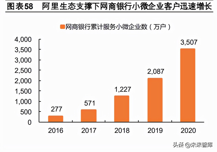 2)大数据风控:网商银行享有阿里系生态的交易、资金、物流等数据资源禀赋,由于这些数据体量庞大、涉及多条交叉验 证逻辑,因此网商银行能够建立复杂的风控模型,以验证客户的真实交易背景,构建出为无信贷记录、无抵质押资产的自有 生态用户提供增信的能力。(报告来源:未来智库)