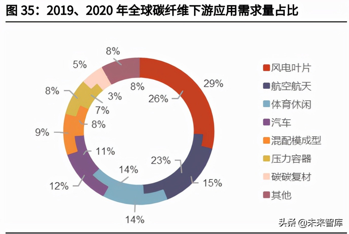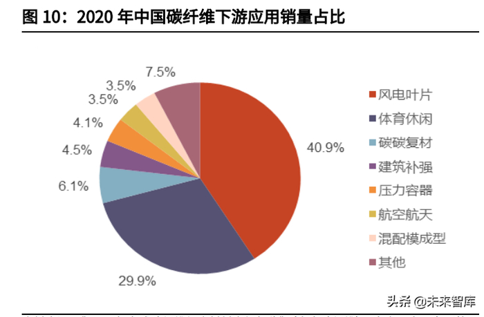 碳纤维复合材料凭借其优异性能,在航空航天、武器装备、风电叶片、轨道 交通等领域具有无可替代的地位。当前,我国碳纤维的下游应用(销量口径)主 要集中在风电叶片和体育休闲领域,其中风电叶片领域发展势头强劲,2020 年 风电叶片领域的碳纤维需求量首次超过体育休闲领域的需求量。由于新冠疫情冲 击,2020 年航空航天领域的碳纤维需求增速有较大幅度下降。然而对比我国与 全球碳纤维下游需求行业分布可以看到,我国碳纤维在航空航天与 汽车领域的应用规模远低于全球相应的规模,因而我国碳纤维在这些领域的应用 同样具备较大的发展潜力。