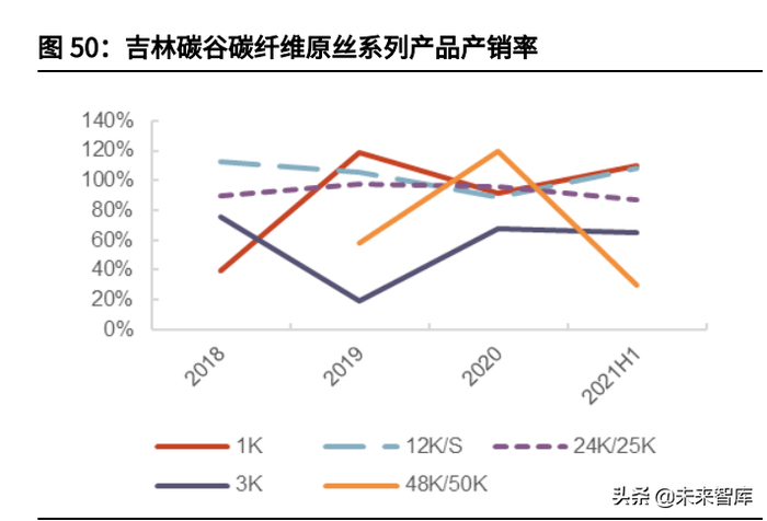目前,公司已经实现了从中小丝束碳纤维原丝到以大丝束碳纤维原丝为主、 中小丝束原丝共同发展的产品结构。公司将 24K/25K/48K/50K 产品划分为大丝 束,2020 年公司大丝束碳纤维原丝销售量占总碳纤维原丝销量的比例已达 75.34%。