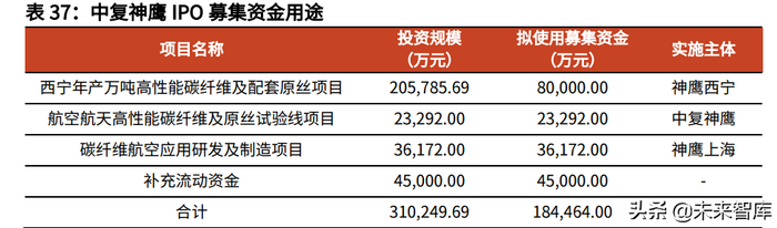 上市募资助力产能扩增,产品应用多点开花。2021 年 12 月 15 日公司科创 板 IPO 成功过会,拟募资 18.4 亿元投入三大产能扩建项目,并补充流动资金。 西宁年产万吨高性能碳纤维及配套原丝项目总投资规模 20.6 亿元,产品应用于 工业、土木工程、医疗器械、体育用品等方向;一阶段 6000 吨产能建设已经完 成,二阶段 4000 吨产能建设拟动用募集资金 8 亿元,预计 2022 年 3 月前完成, 届时总产能将达万吨,有力满足高用量领域的市场需求,且规模效应下平均生产 成本将进一步降低,提升产品利润水平。连云港航空航天高性能碳纤维及原丝试 验线项目拟投资 2.3 亿元,预计于 2023 年第三季度试生产,形成年产 200 吨中 高模碳纤维的规模,支持公司把握商用航空领域的市场机遇。上海碳纤维航空应 用研发及制造项目拟投资 3.6 亿元,配备 1 条单线满负荷产能 100 万平方米/年 的航空预浸料中试线,1 条单线满负荷产能 200 万平方米/年的高模预浸料生产 线,预计于 2023 年年底前试生产,推动公司向产业链下游延伸获取高附加值, 显著放大盈利空间。