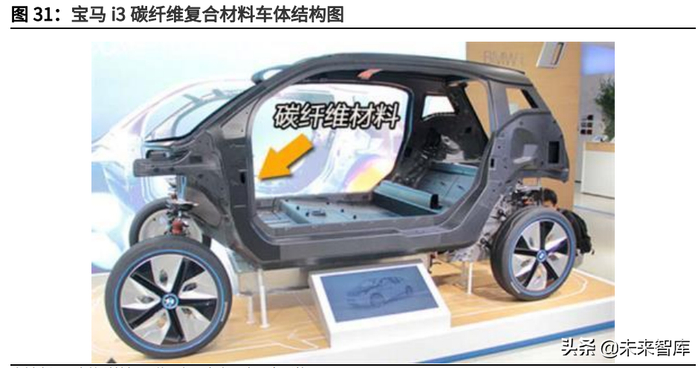 近年来,碳纤维复合材料被广泛应用于汽车的车身、刹车片、传动轴、发动 机、燃料箱、尾部沸腾器和新能源汽车动力电池箱体等,使汽车部件轻量化的同 时更加节能环保。在全球各大汽车厂商中,宝马率先实现碳纤维在量产车上的突 破性应用,开创了车用碳纤维新时代。每辆宝马 i3 约使用 200-300kg 碳纤维复合 材料,减少了约 250-350kg 重量,整车重量仅 1224kg。同时,由于车身较轻, 大幅度提升了车辆性能和续航里程,节省了约 1299 美元电池成本。