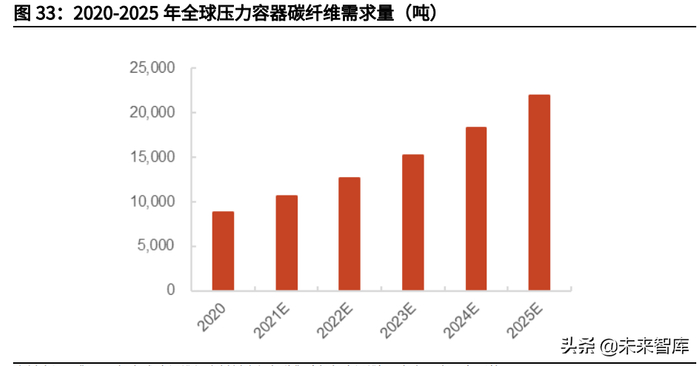 氢燃料电池汽车高速发展,有望大幅提振储氢罐用碳纤维需求。氢燃料电池 汽车因其零排放无污染、加氢时间短、续航里程长、效率高等优点成为现代汽车 的发展方向之一,也是当前氢能利用的主要方向,氢燃料电池汽车的快速发展有 望大幅推动用于制造汽车储氢罐的碳纤维需求。赛奥碳纤维数据显示,2020 年 全球压力容器的碳纤维需求为 8800 吨,预计 2025 年将达 2.2 万吨,五年 CAGR 高达 20%。(报告来源:未来智库)