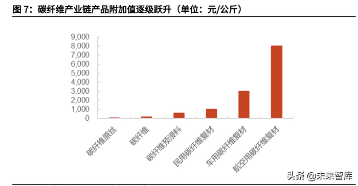 因此,率先进入碳纤维产业实现技术突破的领先公司,不仅在技术壁垒中稳 固立足,还可以基于先发优势逐渐向产业链下游延伸获取高额的回报,显著放大 盈利空间,围绕“技术水平、投资门槛和盈利空间”构筑长期市场竞争力,打造 深厚的企业护城河。(报告来源:未来智库)