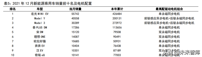 乘联会统计的 2021 年 12 月新能源乘用车销量前十的车型中,有双电机版本的车型是特斯拉 Model Y、特斯拉 Model 3、比亚迪宋DM、理想ONE 和比亚迪汉EV。部分车型不同版本的驱动电机数量不同,我们则按版本数量占比推算双电机版本的销量占比。2021 年 12 月销量前十名的新能源乘用车车型,全年累计销量之和为 147 万辆,占全年新能源销量的 45%。其中,双电机车型的销量为40万辆,渗透率为 27%。