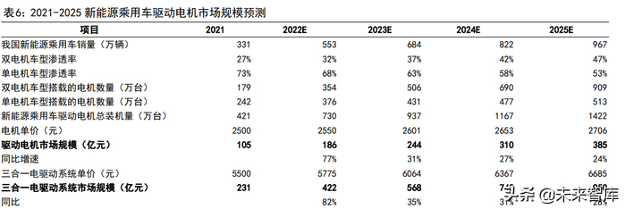 考虑到消费者对新能源乘用车的性能要求不断提升,电机技术进步、生产规模扩大带来的成本下降,我们预计双电机车型的渗透率会不断提升。根据我们的测算,2021 年的双电机车型渗透率大约为 27%,按每年 5%的速度提升,则2025年双电机车型的渗透率有望达到 47%,双电机车型搭载的驱动电机数量有望达到909万台,新能源乘用车驱动电机装机总量有望达到 1422 万台。