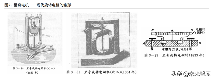 首个旋转电机:1833 年,英国伦敦大学的里奇发明了一种旋转电磁针。磁针上绕有线圈,线圈两端浸入环形水银槽内。接通电池后,受地磁场作用,磁针偏向南北方向,再改变电流方向,使磁针继续旋转。里奇电动机是现代旋转电动机的雏形,磁针相当于转子,地磁场相当于定子,水银槽则扮演了换向器的角色。