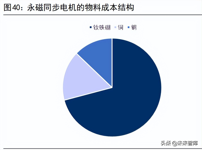 5)成本问题:永磁同步电机的转子由于要使用钕铁硼等稀土材料,物料成本明显高于感应异步电机。以一台常见的功率为 30KW 的驱动电机为例,钕铁硼、铜和钢是制造电机的主要材料,永磁同步电机这三种物料成本大约比感应异步电机高68%,钕铁硼材料的成本在永磁同步电机的三大主要物料成本中的占比高达71%。
