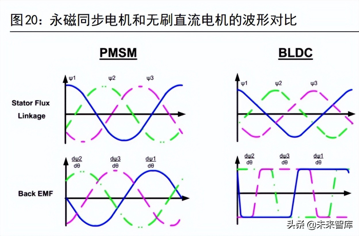 但是,直流电机存在一些固有缺陷,在交流电机的技术取得实质性进步后,直流电机目前已处于被淘汰的边缘。 1)有刷直流电机:电刷在有刷直流电机中起电流换向的作用。在实际使用中,电刷磨损很快,经常需要维护,同时换向火花限制了电机的高速运行,对电机的稳定性和安全性也构成了威胁,这些问题都难以克服。2)无刷直流电机:无刷直流电机的电压波形和电流波形是矩形波或梯形波,伴随着较大的转矩脉动,在汽车行驶中有明显顿挫感,对用户体验构成负面影响。交流电机的波形则通常是正弦波,转矩更加平顺,振动问题较小。