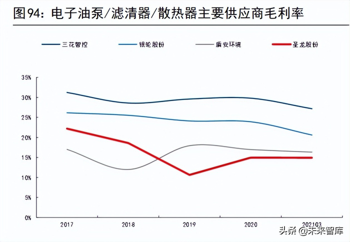 2021 年前三季度,三花智控/银轮股份/盾安环境/圣龙股份的毛利率分别为27%/21%/16%/15%,净利率分别为 11%/4%/5%/8%。三花智控在毛利率和净利率方面均有优势。