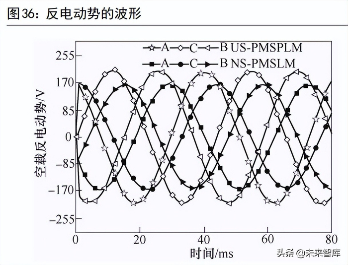 4)自启动问题:永磁同步电动机一旦接通电源,旋转磁场立即产生并高速旋转。转子由于惯性来不及跟着转动,当定子磁极一次次越过转子磁极时,前后作用在转子磁极上的磁力大小相等、方向相反,间隔时间极短,平均转矩为零,因此永磁同步电机不能自行启动。解决自启动问题需要额外配置变频器(外部变频,缓慢升速),或在转子内加入感应异步电机的鼠笼结构。