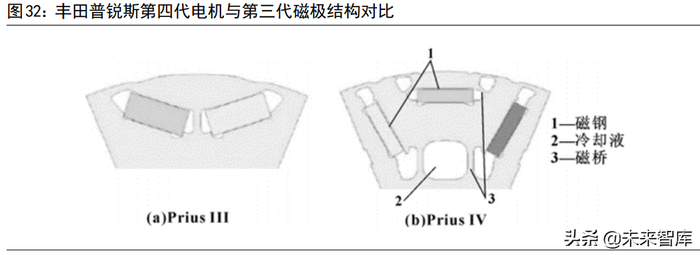 3)结构简洁紧凑:永磁同步驱动电机不设置励磁电源结构以及励磁绕组结构,降低相关结构复杂性,相关构成较为紧密,保证永磁同步驱动电机运转更加具有可靠性。丰田普锐斯搭载的第四代永磁同步电机相较于第三代,定子直径下降了20%,整体结构更紧凑,体积更小。