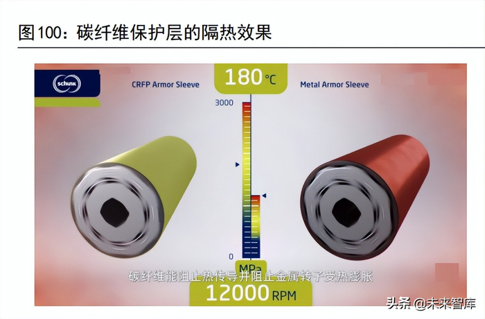 此外,碳纤维保护层可增加转子的磁通量。根据特斯拉的专利文件,因为有了碳纤维保护层,原有的固定磁体的部分铁片可以省去,纤维管和磁铁之间没有金属,可减少对磁通的屏蔽。散热方面,碳纤维保护层有利有弊。基于碳纤维材料优秀的隔热性能,电机的主要热源,即定子铜线绕组发热,对转子的负面影响被削弱。但是,转子本身在高速工况下同样发热,碳纤维保护层限制了转子的散热。给转子添加碳纤维保护层的主要壁垒在于加工工艺复杂。由于不同材料的膨胀系数不同,碳纤维所使用的环氧树脂材料必须在高强度张力下缠绕在定子上,否则在低温下碳纤维会松动。