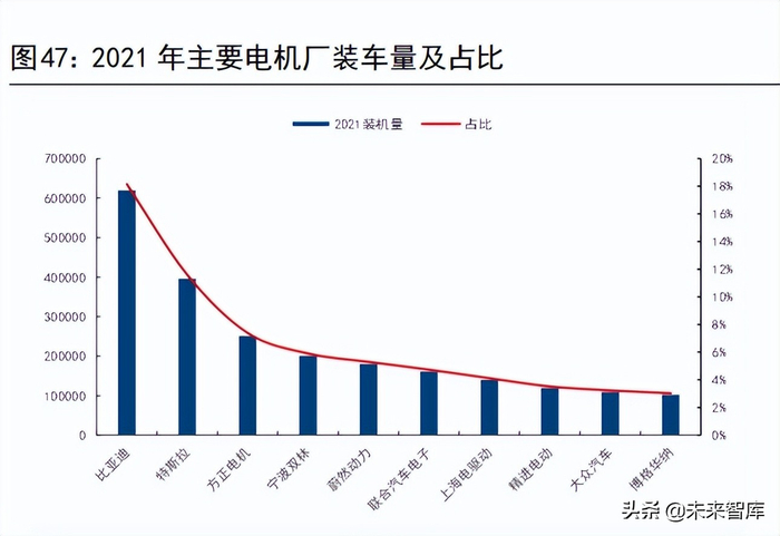 根据高工锂电的数据,在国内主要电机厂商中,2020 全年前两名的厂商(比亚迪/特斯拉)市场份额合计达到了 26%,前五名的厂商合计市场份额达到了48%,前十名的厂商合计市场份额达到了 71%。2021 全年,前两名的厂商(比亚迪/特斯拉)合计市场份额达到了 30%,前五名的厂商合计市场份额达到了48%,前十名的厂商合计市场分额达到了 67%。