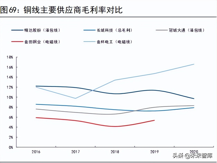 从营业收入来看,精达股份/长城科技/冠城大通/金杯电工在2020 年的相关业务销售收入分别为 85/62/36/12 亿元,金田铜业在 2020 年未单独披露电磁线业务收入,2019 年收入为 39 亿元,精达股份收入水平领先。从毛利率来来看,2020年精达 股 份 / 长 城 科 技 / 冠 城 大 通 / 金 杯 电 工的相关业务毛利率分别为10%/8%/8%/17%,金田铜业在 2020 年未单独披露电磁线业务毛利率,2019年毛利率为 5%,金杯电工毛利率水平领先。