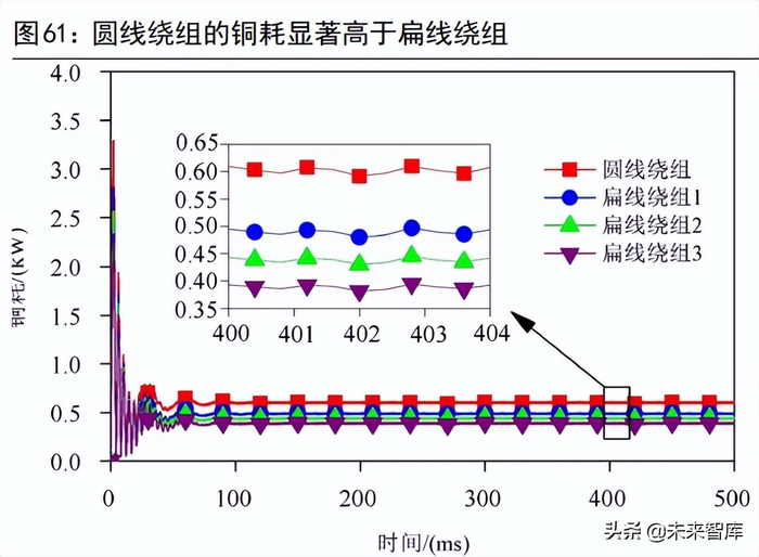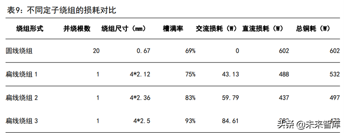 铜耗具体可分为直流损耗和交流损耗。直流损耗圆线和扁线都有,但是圆线绕组由于单个绕组的截面尺寸较小,交流损耗几乎可以忽略不计,而扁线绕组由于导体截面尺寸较大,受趋肤效应和邻近效应影响,交流损耗也很重要。直流损耗方面,在电流相数和电流有效值给定的情况下,直流损耗与绕组的直流电阻成正比。由于圆线更细,电阻更高,因此圆线电机的直流损耗通常高于相同条件下的扁线电机。根据《绕组形式对永磁电机磁热性能的影响》,在有限元软件中对额定功率为 35KW 的永磁同步电机的直流损耗进行仿真计算,圆线绕组的直流损耗为 601.6W,扁线绕组的直流损耗为 388-488W,与圆线绕组相比下降了113-214W,降幅为 19%-36%。