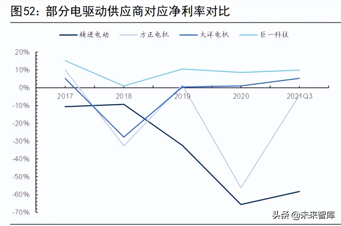 从相关业务的毛利率来看,精进电动(营业总毛利)、方正电机(汽车应用类)、大洋电机(新能源车辆动力总成系统)、巨一科技(新能源汽车电机驱动系统)在 2021 年上半年的毛利率分别为-6%/4%/13%/15%,2020 全年的毛利率分别为2%/9%/18%/15%。大洋电机和巨一科技的毛利率相对较高。从销售净利率来看,2021 年前三季度,精进电动/方正电机/大洋电机/巨一科技的销售净利率分别为-58%/-4%/5%/10%。2020 年全年,精进电动/方正电机/大洋电机/巨一科技的销售净利率分别为-66%/-56%/1%/9%。大洋电机和巨一科技的净利率相对较高。