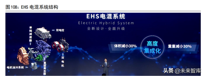 得益于优异的电驱动系统设计,E 平台 3.0 的零百加速可达到2.9S,续航里程可达到 1000KM,百公里电耗比同级别车型低 10%,冬季续航里程增加10%。在插混系统方面,比亚迪的 DMI 超级混动的 EHS 电混系统采用了双电机(发电机+电动机)双电控的集成化设计,串并联架构,集成了双电机、双电控、单档减速器、直驱离合器、电机油冷系统,体积和重量减小了30%。