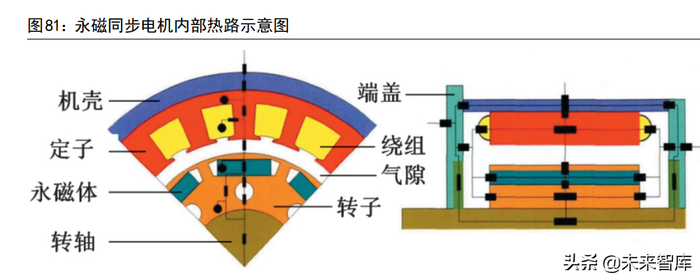 5)散热需求强:由于新能源汽车驱动电机对功率密度的高要求,散热问题也随之而来。1 台 150KW 的传统动力系统总成,体积大概在409L。峰值功率150KW的电动汽车动力系统总成,体积只有 82L,大约只有传统动力总成的20%。小体积内的高功率,导致散热、机械振动、电磁兼容、NVH 啸叫等问题。电机的能量转换效率大约在 90%以上,峰值效率大约在 95%左右,平均能量损耗大约10%,这10%的能量损耗多以发热的形式体现,因此驱动电机的散热需求较强。
