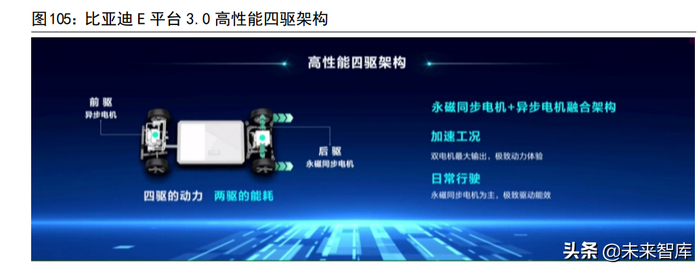 在纯电平台方面,比亚迪最新的 E 平台 3.0 采用了前驱感应异步电机+后驱永磁同步电机的技术方案,二者互补,在日常行驶中以永磁同步电机为主,在加速工况下双电机最大输出。