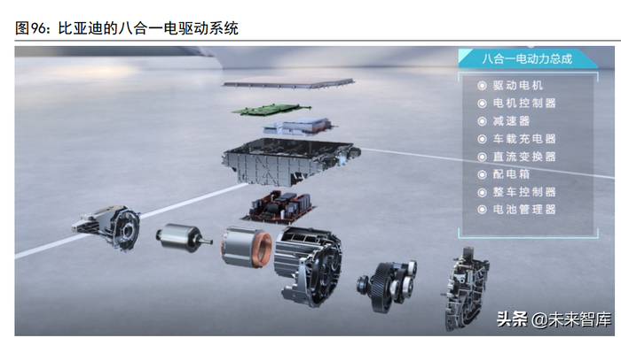 电驱动系统“多合一”的集成化方案可以让系统内的零部件共享外壳耦合及冷却系统(例如减速器润滑油可以用来冷却驱动电机,特斯拉回收电机热量给电池保温),共享电路及功率半导体,减少线缆用量,有效缩小电驱动系统的体积和重量,提高功率密度,实现轻量化。 1)适用性广:多合一电驱动系统需要顶层设计,从车型平台上进行规划,这样可以大幅缩短开发周期,并能以较低成本满足多种车型的需求;2)成本降低:减少动力总成内部的高压线束、连接器等零件,减轻重量,降低成本; 3)空间精简:更紧凑地整合电机、逆变器、减速器等模块,解放空间,利于整车布置; 4)能效提高:减少或缩短逆变器与电机之间的连接配线,降低电力损耗,提升电驱动系统的能量利用效率;