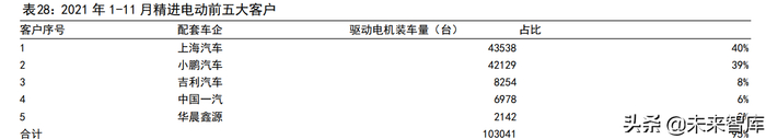 根据高工锂电的数据,2021 年 1-11 月,在主要车企中,精进电动的前五大客户是 上 海 汽 车 /小 鹏 汽 车/吉 利 汽 车 /中 国 一 汽/华晨鑫源,装机量分别为43538/42129/8254/6978/2142 台,占比分别为 40%/39%/8%/6%/2%。