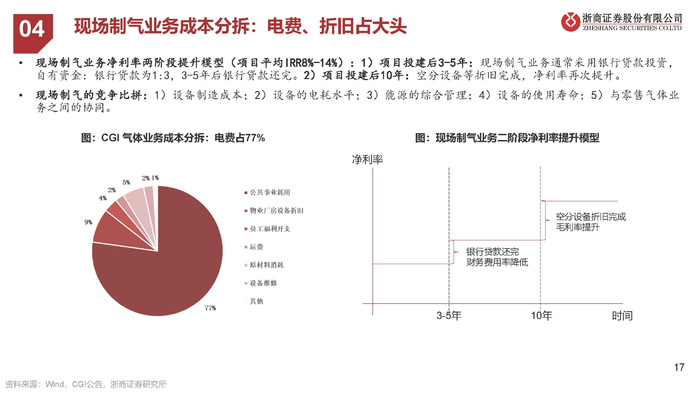 现场制气业务净利率两阶段提升模型(项目平均IRR8%-14%):1)项目投建后3-5年:现场制气业务通常采用银行贷款投资, 自有资金:银行贷款为1:3,3-5年后银行贷款还完。2)项目投建后10年:空分设备等折旧完成,净利率再次提升。 现场制气的竞争比拼:1)设备制造成本;2)设备的电耗水平;3)能源的综合管理;4)设备的使用寿命;5)与零售气体业 务之间的协同。