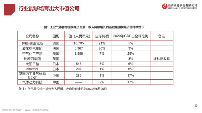 下游应用较分散:林德气体、法液空为全球工业气体龙头,市占率合计41%,具有代表性。