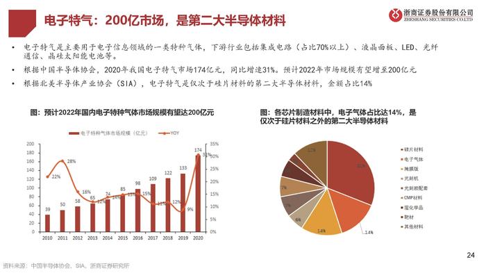 电子特气是主要用于电子信息领域的一类特种气体,下游行业包括集成电路(占比70%以上)、液晶面板、LED、光纤 通信、晶硅太阳能电池等。根据中国半导体协会,2020年我国电子特气市场174亿元,同比增速31%。预计2022年市场规模有望增至200亿元。根据北美半导体产业协会(SIA),电子特气是仅次于硅片材料的第二大半导体材料,金额占比14%。