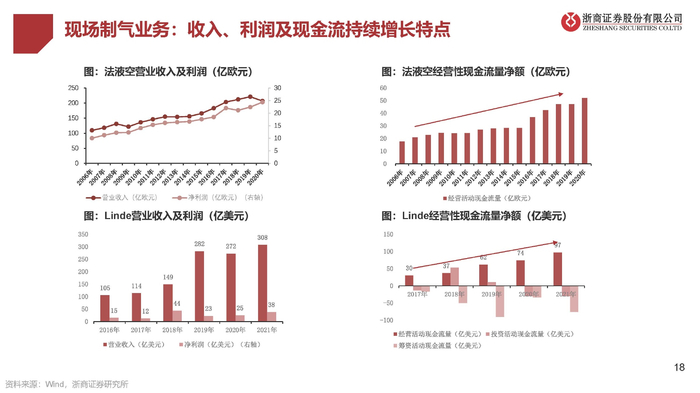 工业气体需求结构不断优化,本质是跟随产业结构变化:金属冶炼、化工能源为主=>锂电、半导体等应用增加 。海外借鉴:林德气体2022年一季度订单储备60亿美元,其中亚太地区占比68%,53%来自于能源,30%来自于电子领域。