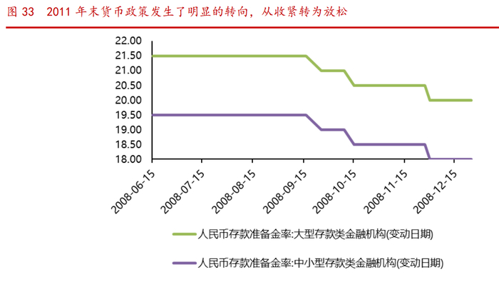 2008 年下半年由于全球金融危机的影响,我国经济压力上升,货币政策开始转 向宽松。央行自 2008 年 9 月下旬开启降准降息通道。存款准备金率四次下调,大型 金融机构累计下调 2 个百分点至 15.5%,中小型金额机构下调 3 个百分点至 14.5%。 在贷款利率上,央行自 9 月到 12 月期间 5 次密集下调贷款基本利率,1 年期贷款基 准利率下降到 5.31%,活期存款利率降至 0.36%。行情启动时 2008 年末 M1 同比增速 下降到 6.8%的较低水平。