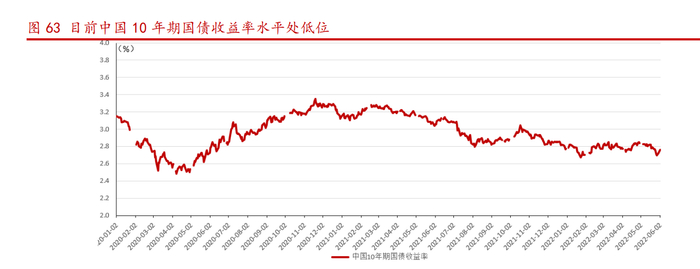 2022 年 5 月以来稳经济政策超预期出台。针对房地产市场,先是最低首套房贷 利率降低 20BP,而后 5 年期 LPR 报价下调 15BP。 2022 年 5 月 24 日国务院发布《扎实稳住经济的一揽子政策措施》(六个方面 33 项措施),此后各地纷纷出台相应的稳住经济一揽子政策措施。 宏观流动性方面,10 年期国债收益率处于较低水平。