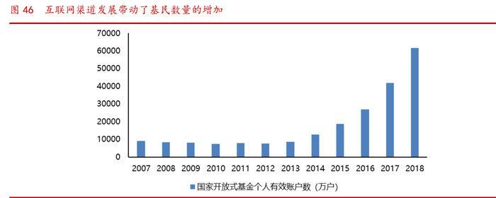 互联网渠道发展带动了基民数量的增加:2013 年 10 月,百度推出理财产品“百 度百赚”,以基金公司直销前置的模式对接华夏基金的华夏现金增利 E。2014 年 1 月,腾讯旗下理财通在微信钱包上线,腾讯正式入局互联网基金销售。2014 年 2 月,腾讯出资认购独立基金销售机构好买财富 18%股份,成为其第二大股东。互联网 公司与基金公司合推互联网货币基金,腾讯理财通正式上线,对接华夏基金、汇添富 基金、易方达基金和广发基金旗下的货币基金。